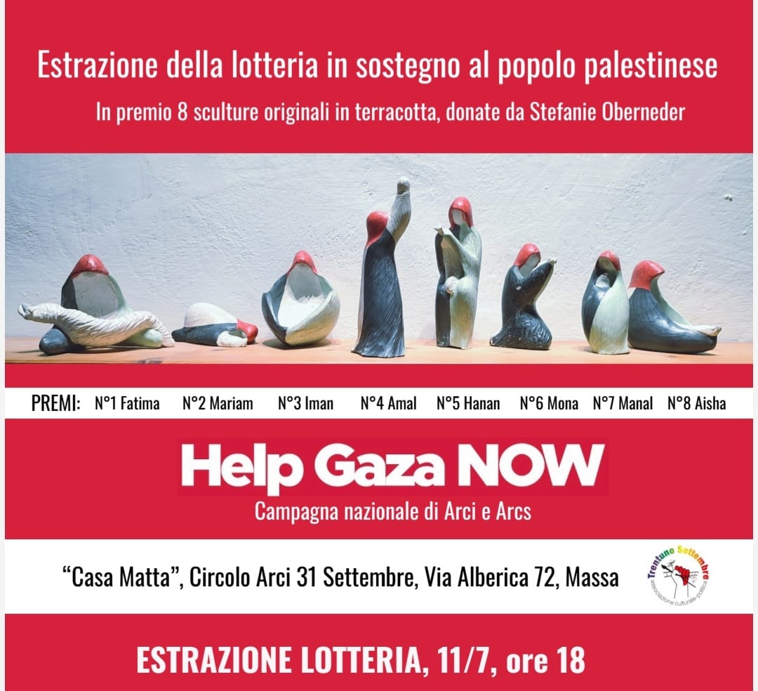 VENERDI 11 LUGLIO ore 18.00 Casa Matta Via Alberica 72 Massa ESTRAZIONE della LOTTERİA in sostegno dei progetti Rec campagna di Arci Mazionale/Arcs HELP GAZA NOW ospiti del circolo Trentuno … Leggi tutto